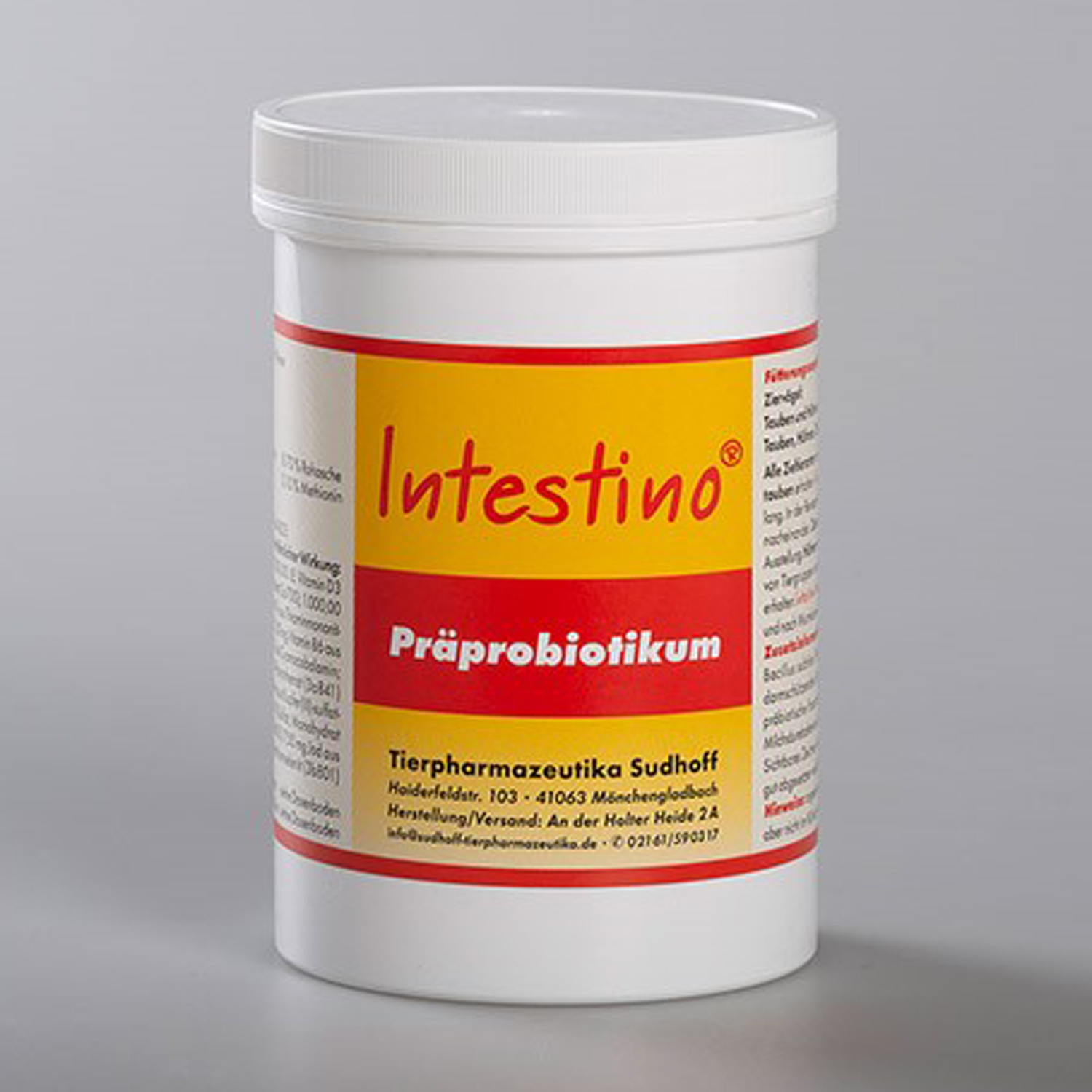 Der Hauptbestandteil des Preprobiotikum Intestino ist der Bakterienstamm Bacillus subtilis PB6, der in zahlreichen wissenschaftlichen Studien seine darmschützenden Eigenschaften bewiesen hat. Des Weiteren enthält Intestino hohe Gehalte an Fructo-Oligo-Sachariden (FOS). Diese FOS aus dem Chicorée sind Faserstoffe, welche die Milchsäurebakterien im Darm im Wachstum anregen.Beide Komponenten fördern ein ausgeglichenes Mikrobiom (Darmflora). Sichtbare Anzeichen eines guten Mikrobioms sind ein fester und trockener Kot mit einer kleinen weißen Kappe (Harnsäure).
