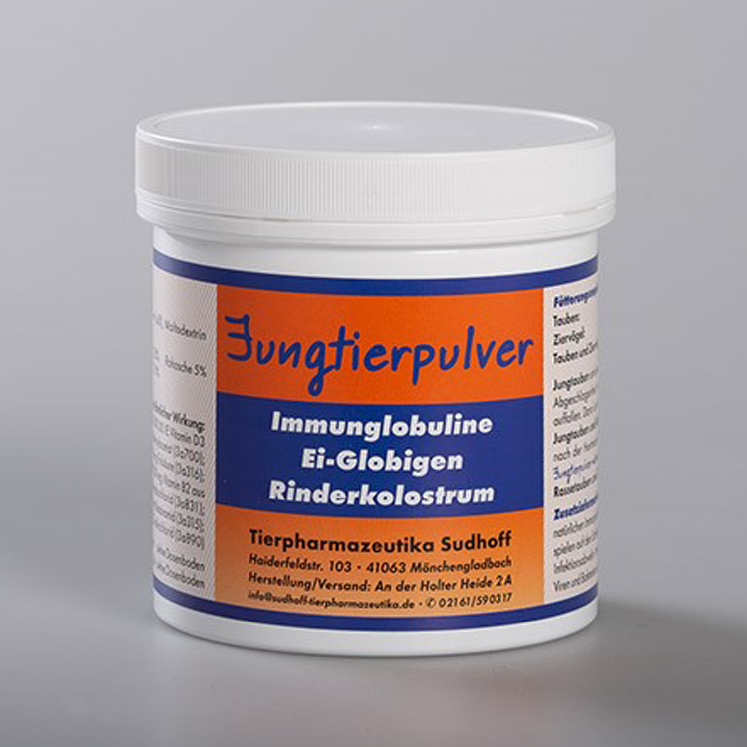 Kein anderes Produkt mit vergleichbarer Wirkung besteht so lange im Brieftaubensektor. Jungtierpulver enthält hochwertige Eiweiße, Albumin und Globulin, und insbesondere viele Immunglobuline. Die Immunglobuline stammen einerseits aus dem Kolostrum speziell vorbehandelter Kühe, andererseits stammen sie aus dem Eigelb speziell vorbehandelter Hühnereier.
