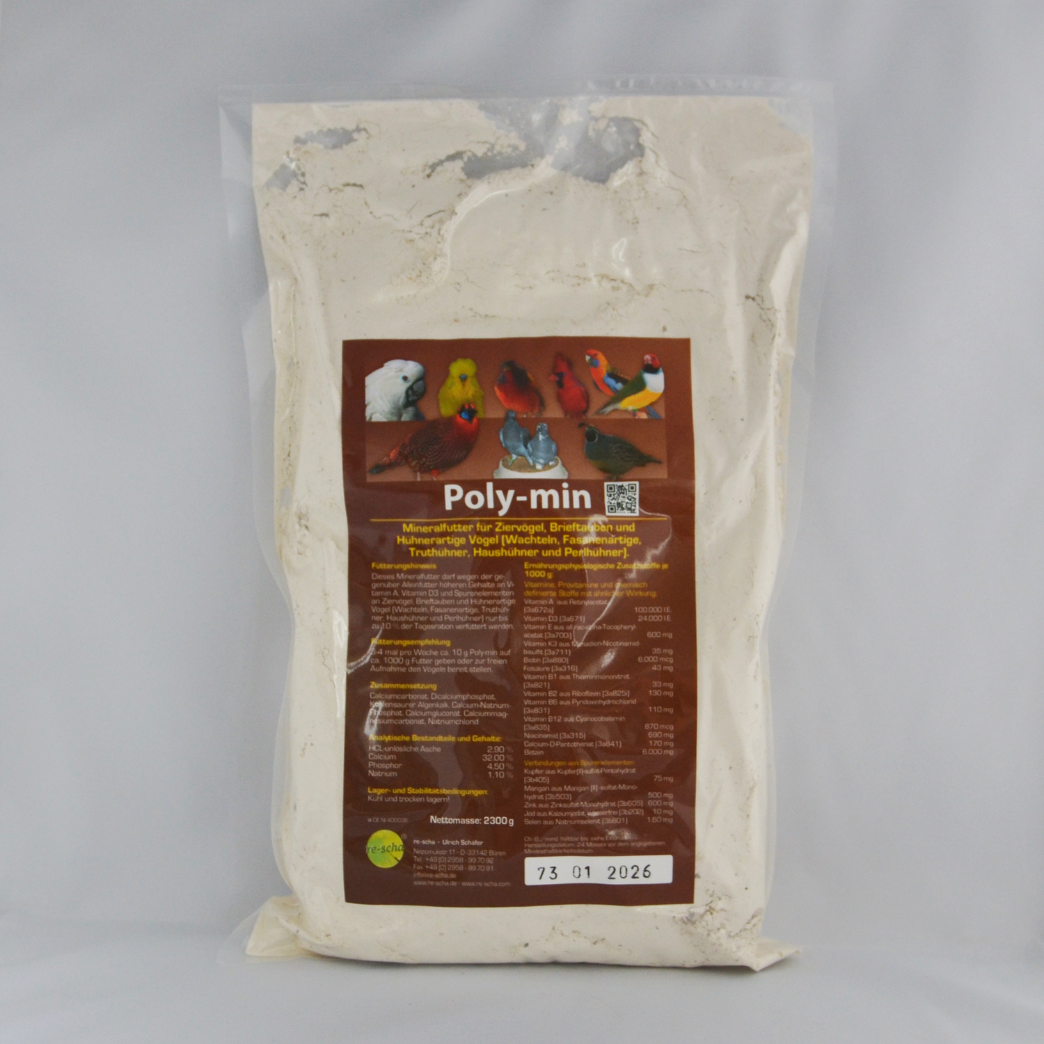 Poly-min enthält Mineralien, die Tauben tagtäglich für ihren Stoffwechsel benötigen. Besonders reichhaltig ist das Poly-min an fein gemahlenen fossilen Austernschalen . Diese sind dafür bekannt, dass sich bei ihnen im Gegensatz zum gemahlenen Kalkstein das Calcium verzögert löst. Dies hat den Vorteil, dass die Taube eine gleichmäßige Calciumversorgung erhält. Tests haben gezeigt, dass fossile Austernschalen als verzögert lösliche Ca-Quelle eine positive Beeinflussung von Tiergesundheit, Wohlbefinden und Leistungssicherung bringen.