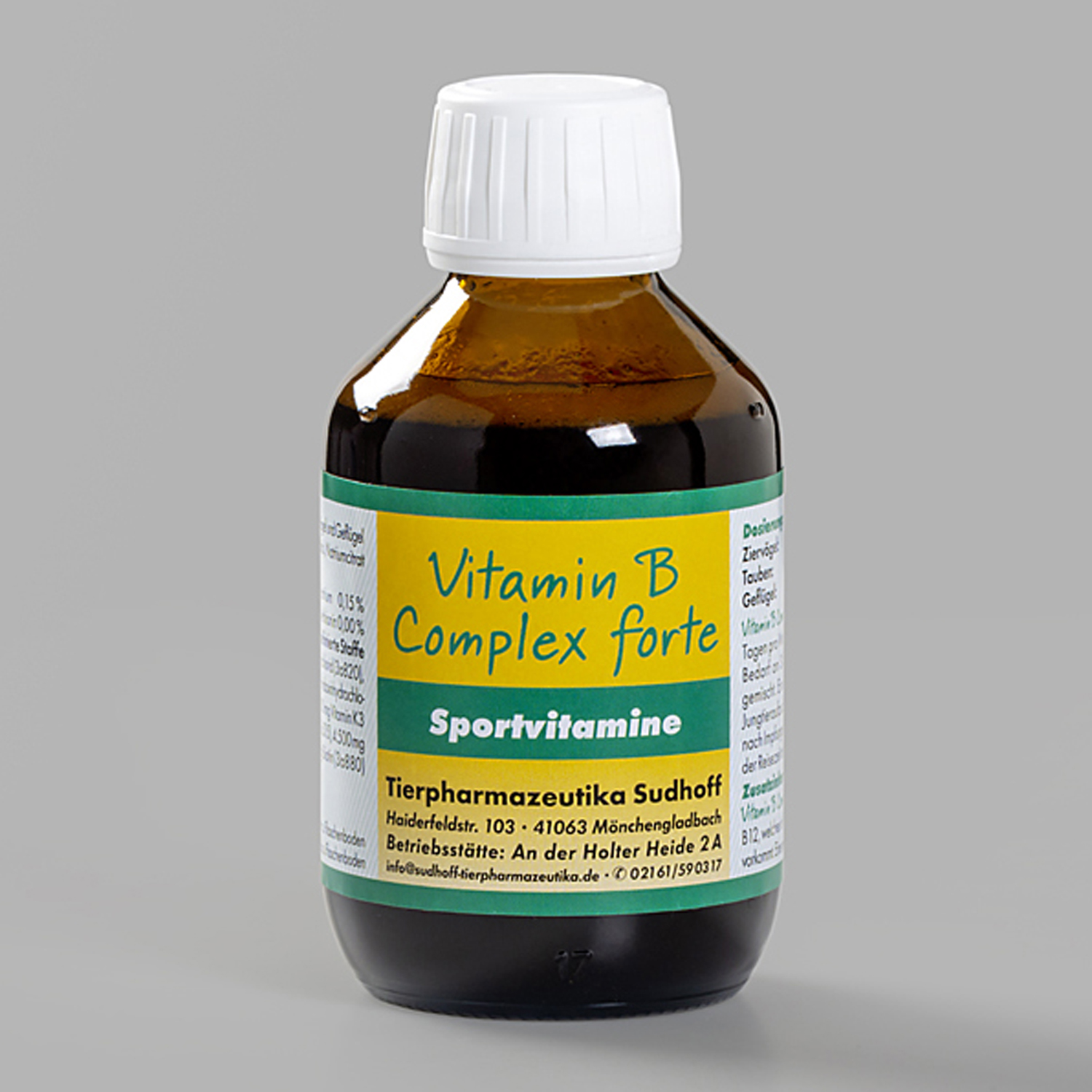 Vitamin B Complex forte ist ein hochdosierter Vitamin B-Komplex mit viel Vitamin B12. Es ist für die Verabreichung mit dem Trinkwasser ideal geeignet, sehr ergiebig und wird in allen Phasen besonderer Belastung verabreicht.