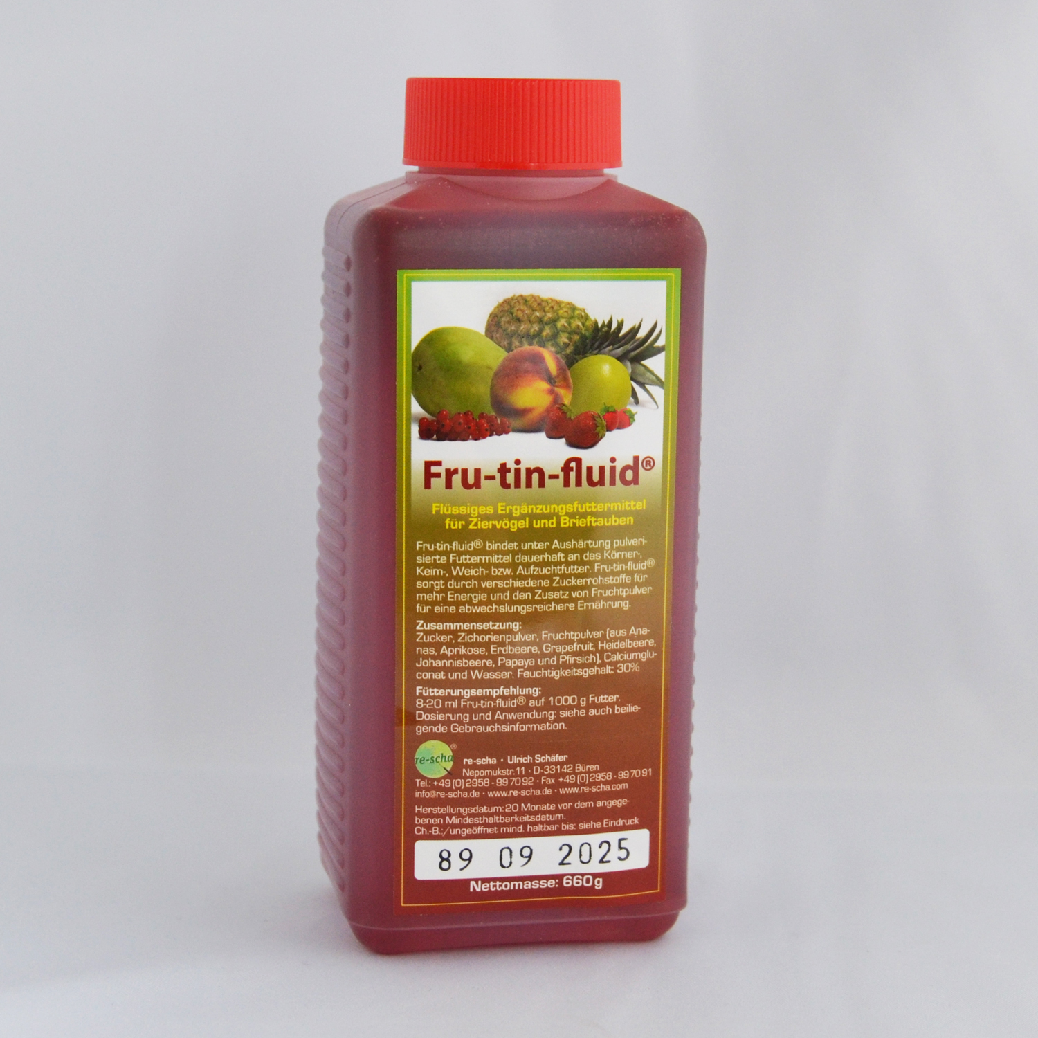 Fru-tin-fluid®, früher auch als „Frutin“ bezeichnet, bindet unter Aushärtung pulverisierte Futtermittel dauerhaft an das Körner-, Keim-, Weich- bzw. Aufzuchtfutter.