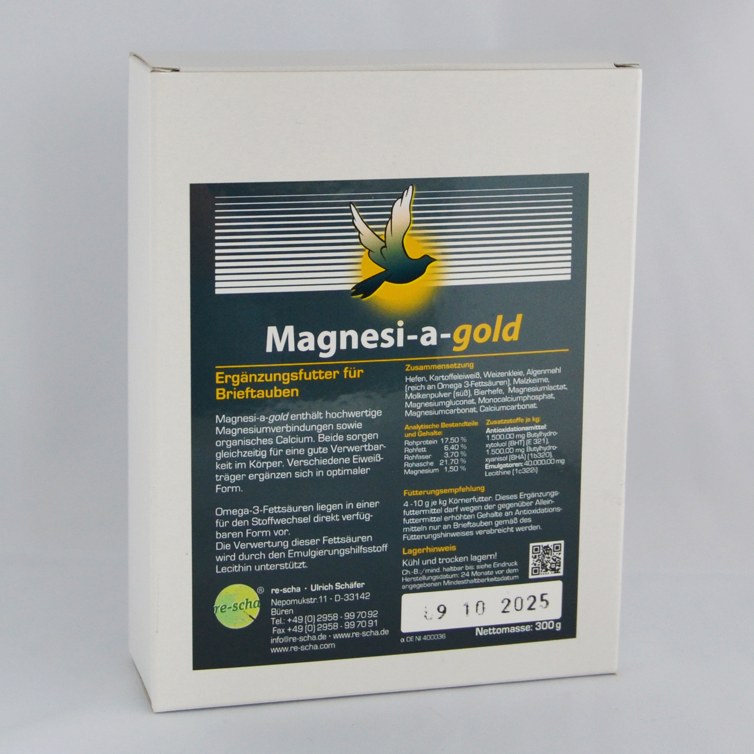 Magnesi-a-gold ist ein Ergänzungsfuttermittel für Brieftauben. Es enthält hochwertige Magnesiumverbindungen sowie organisches Calcium, die im Zusammenspiel für eine gute Verwertbarkeit im Körper sorgen. Verschiedene Eiweißträger ergänzen sich in optimaler Form zu einem ausgewogenen Aminosäurenverhältnis. Omega-3-Fettsäuren liegen in einer für den Stoffwechsel direkt verfügbaren Form vor. Die Verwertung wird durch den Emulgierungshilfsstoff Lecithin unterstützt.